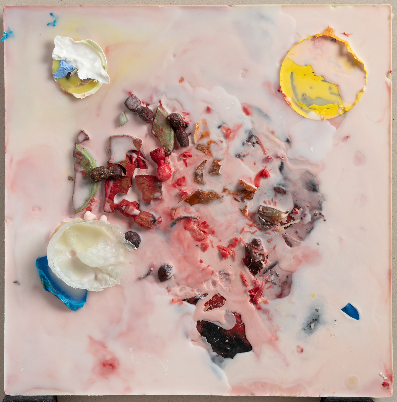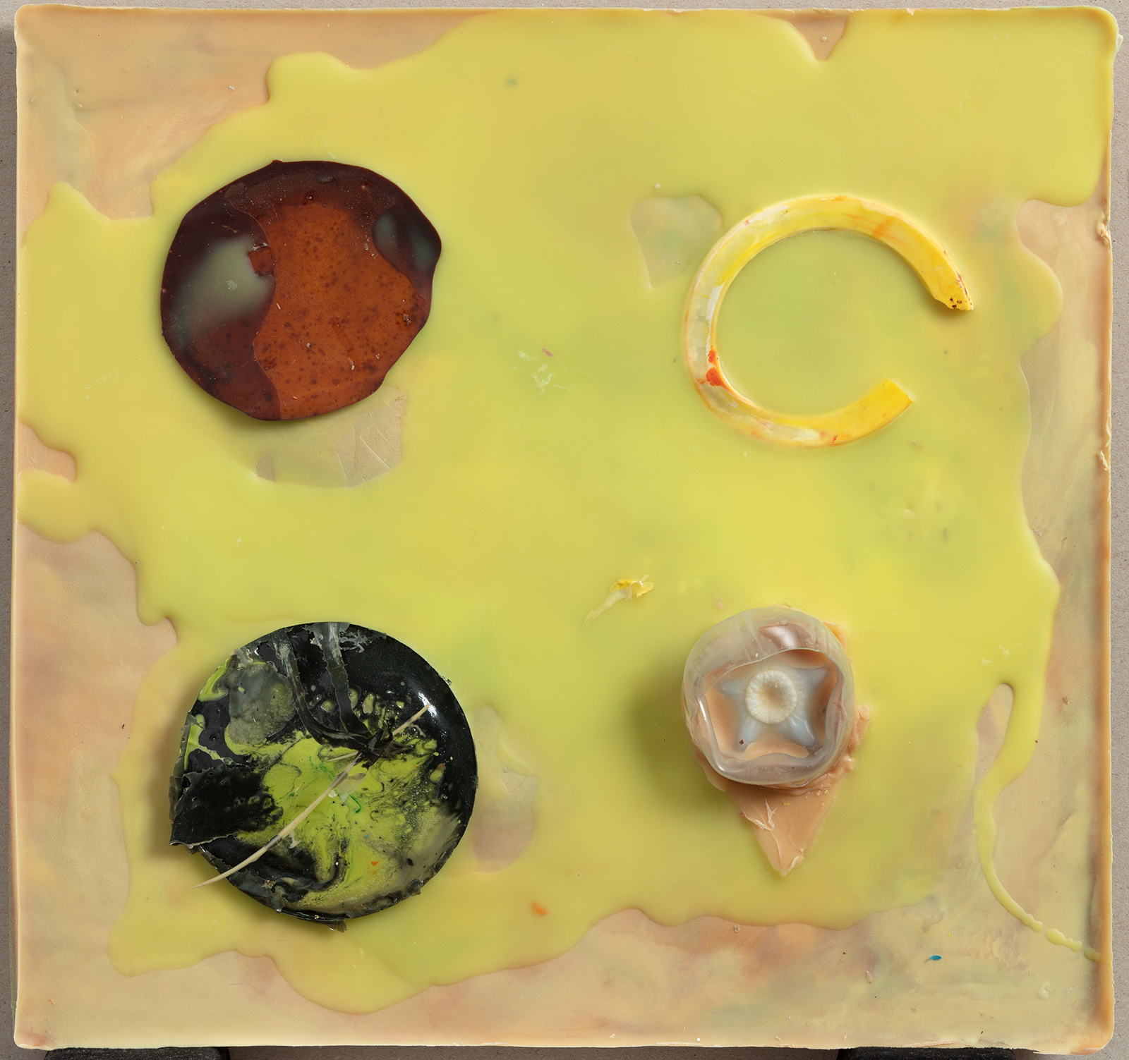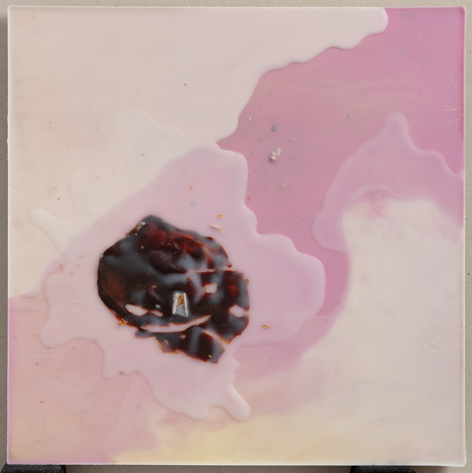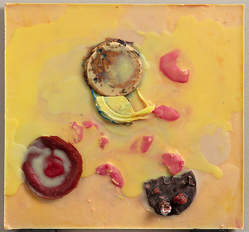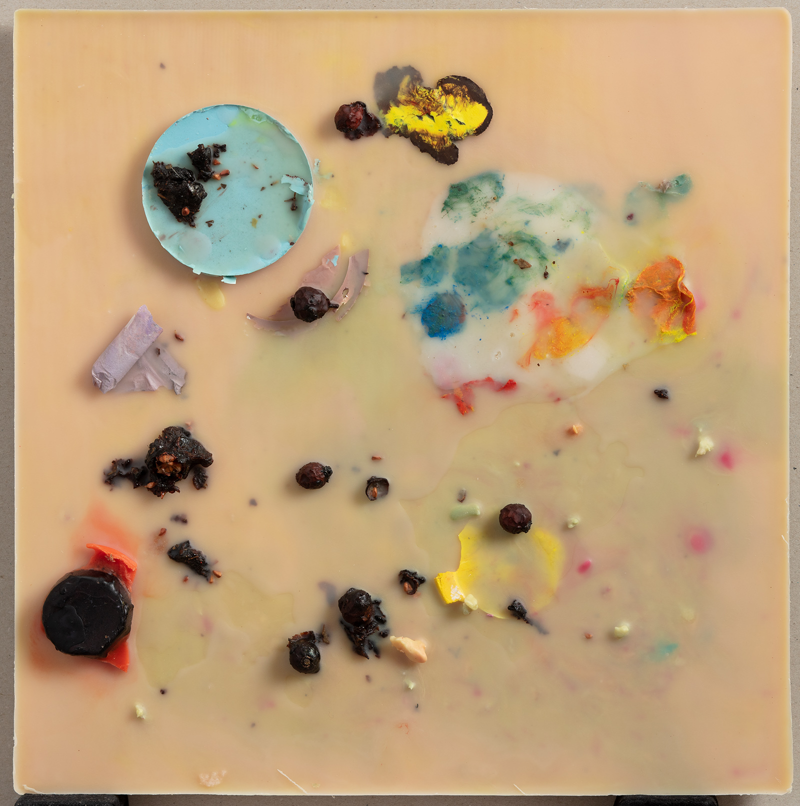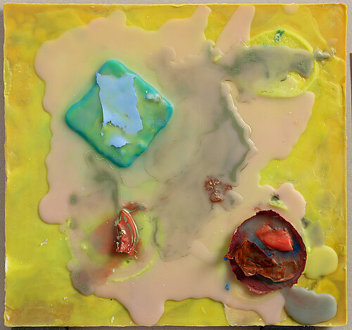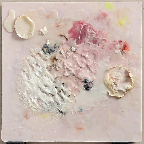 o.T., 2021, Wachs/mixed media auf Schichtholz, 35x35x3,5 cm